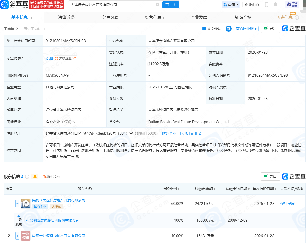 企查查APP显示,近日,大连保鑫房地产开发有限公司成立,法定代表人为刘旭,注册资本为4.12亿元,经营范围包含:房地产开发经营;住房租赁;非居住房地产租赁;土地使用权租赁;房屋拆迁服务;园区管理服务等。企查查股权穿透显示,该公司由保利发展(600048)全资子公司保利(大连)房地产开发有限公司、沈阳金地恒耀房地产开发有限公司共同持股。
