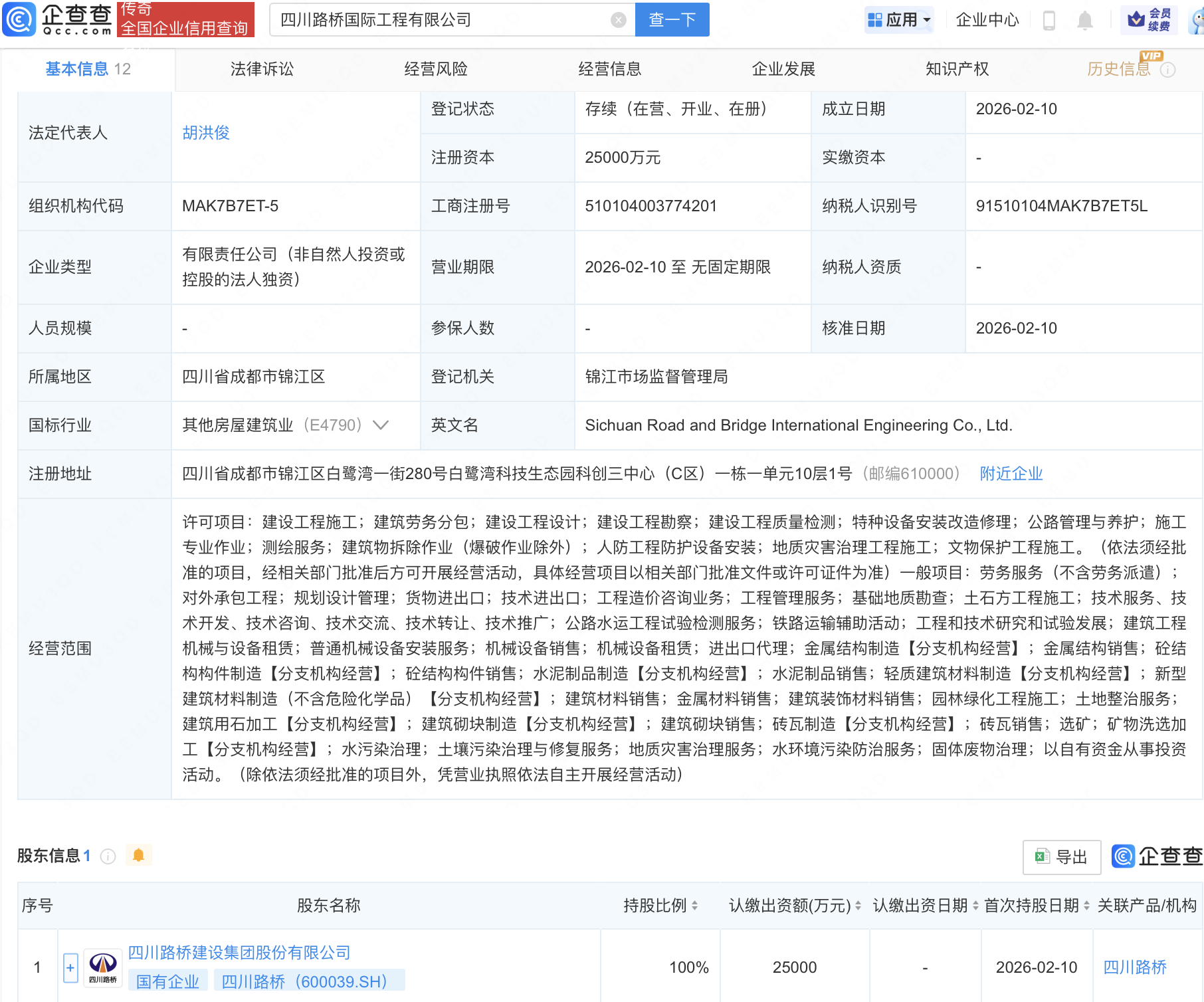 企查查APP显示,近日,四川路桥国际工程有限公司成立,注册资本2.5亿元,经营范围包含:建设工程施工;建筑劳务分包;建设工程设计;建设工程勘察;建设工程质量检测等。企查查股权穿透显示,该公司由四川路桥(600039)全资持股。