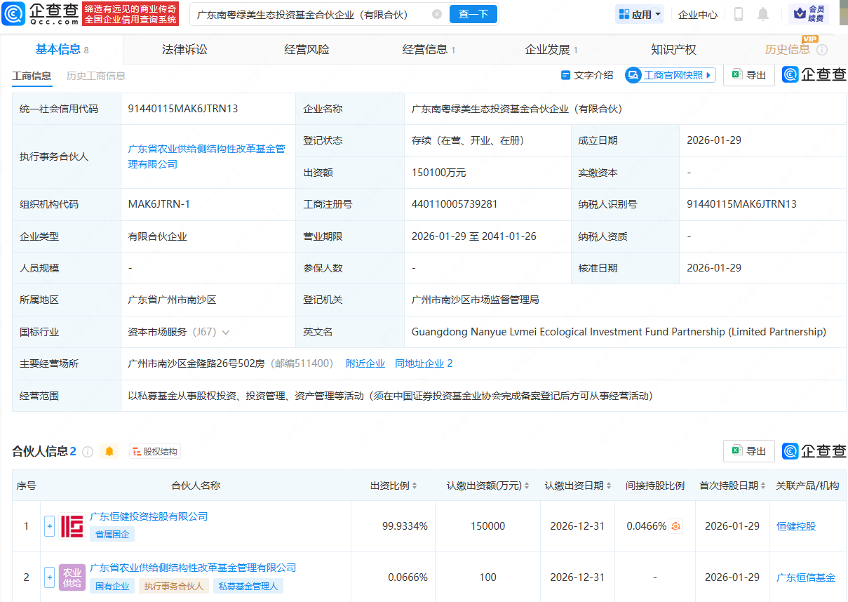 企查查APP显示,近日,广东南粤绿美生态投资基金合伙企业(有限合伙)成立,出资额约15亿元,经营范围包含:以私募基金从事股权投资、投资管理、资产管理等活动。企查查股权穿透显示,该合伙企业由广东恒健投资控股有限公司、广东省农业供给侧结构性改革基金管理有限公司共同持股。