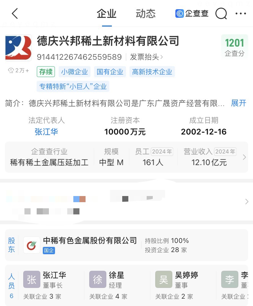 企查查显示,德庆兴邦稀土新材料有限公司成立于2002年12月,法定代表人为张江华,由中稀有色(600259)全资持股。