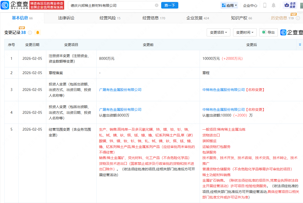 企查查APP显示,近日,德庆兴邦稀土新材料有限公司发生工商变更,注册资本从8000万元增加到1亿元;同时,公司的经营范围变更为“稀有稀土金属冶炼;货物进出口;装卸搬运;稀土功能材料销售;金属矿石销售等”。