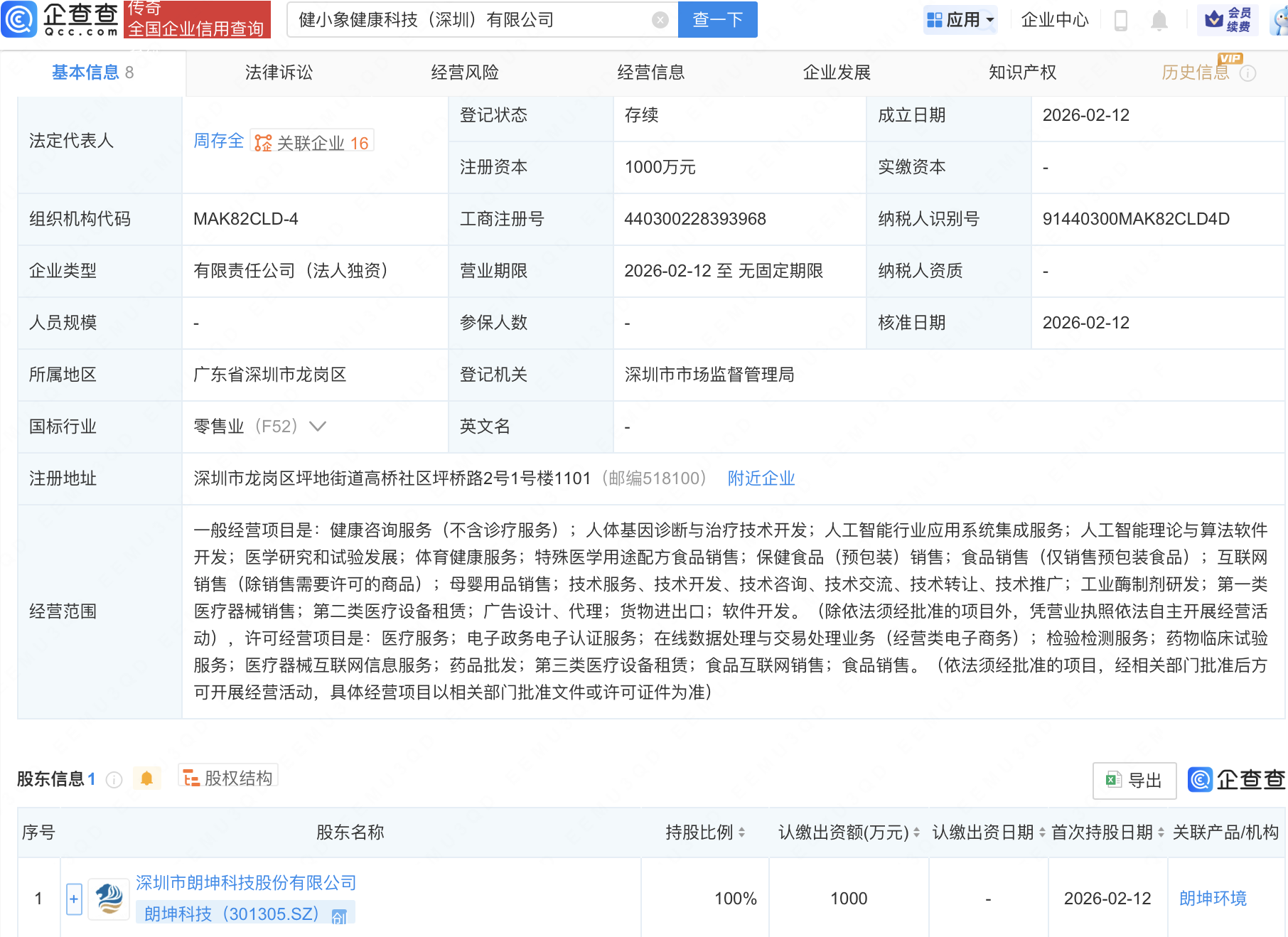 企查查APP显示,近日,健小象健康科技(深圳)有限公司成立,注册资本1000万元,经营范围包含:人体基因诊断与治疗技术开发;人工智能行业应用系统集成服务;人工智能理论与算法软件开发等。企查查股权穿透显示,该公司由朗坤科技(301305)全资持股。
