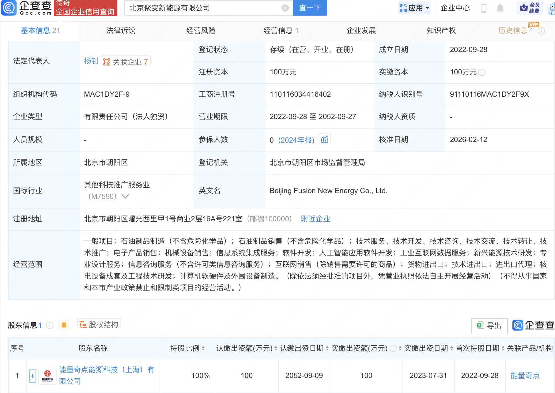 企查查APP显示,近日,原能量奇点能源科技(北京)有限公司发生工商变更,企业名称变更为北京聚变新能源有限公司,同时经营范围新增石油制品制造(不含危险化学品);石油制品销售(不含危险化学品)。企查查信息显示,该公司成立于2022年,由能量奇点能源科技(上海)有限公司全资持股。
