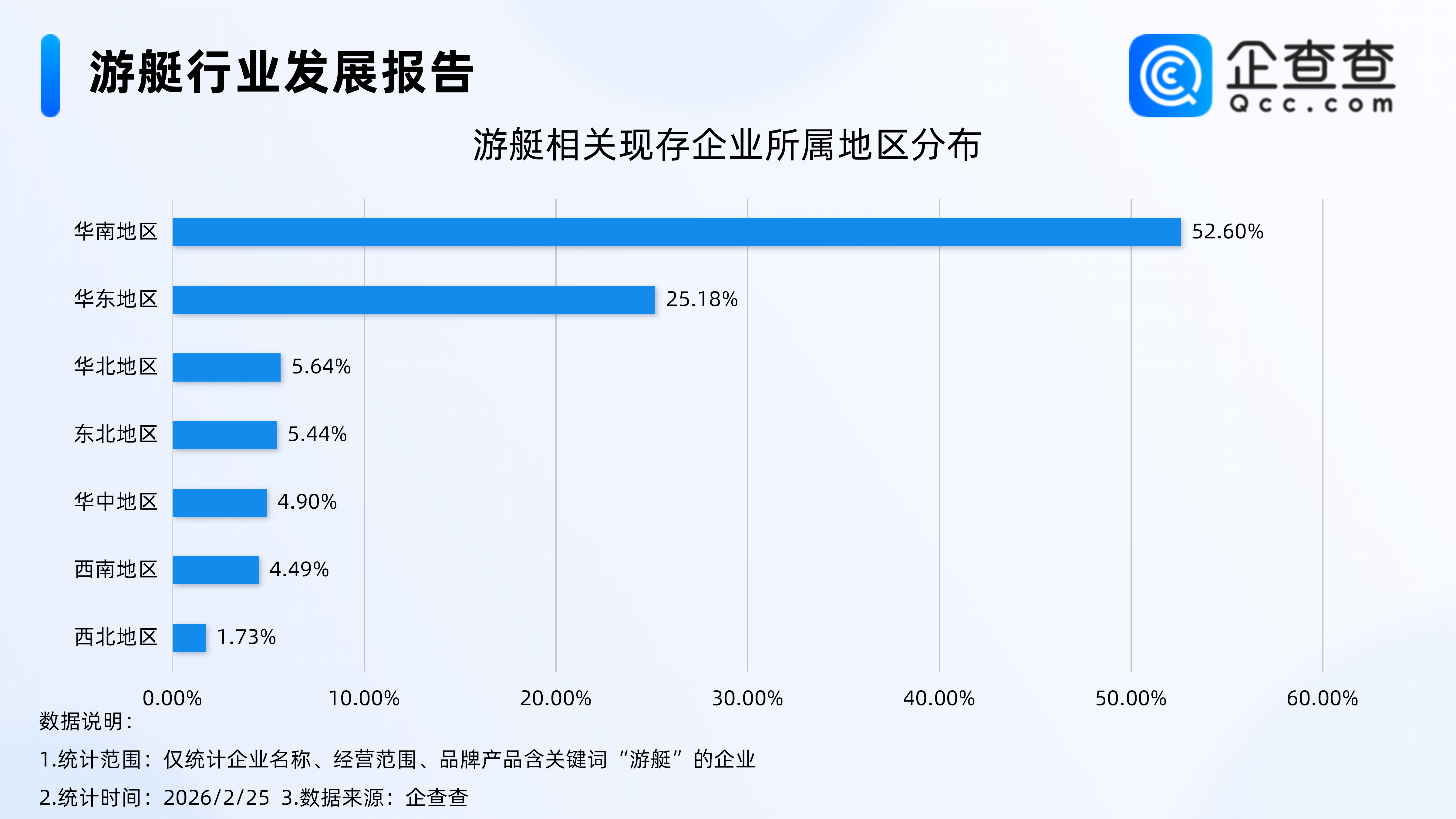 企查查数据显示,截至2月25日,国内游艇相关现存企业达4.1万家,主要分布在华南地区,占比达52.6%。其次为华东地区,占比达25.18%。分布在华北、东北、华中、西南、西北地区相关企业占比均不足6%。