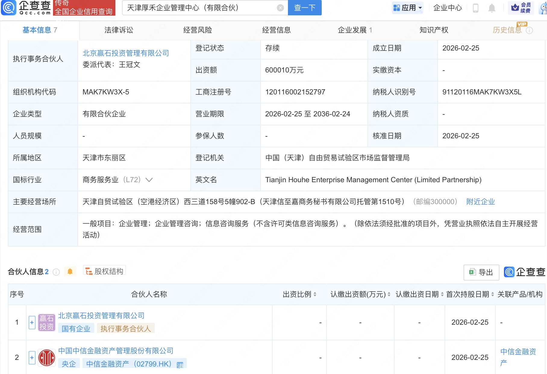 企查查APP显示,近日,天津厚禾企业管理中心(有限合伙)成立,出资额约60亿人民币,经营范围为企业管理、企业管理咨询、信息咨询服务。企查查股权穿透显示,该企业由中信金融资产(02799.HK)等共同出资。