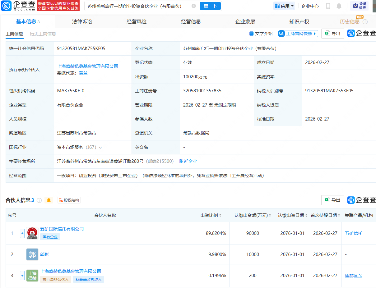 企查查APP显示,近日,苏州盛新启行一期创业投资合伙企业(有限合伙)成立,出资额约10亿元,经营范围包含:创业投资(限投资未上市企业)。企查查股权穿透显示,该合伙企业由五矿国际信托有限公司、上海盛赫私募基金管理有限公司等共同持股。