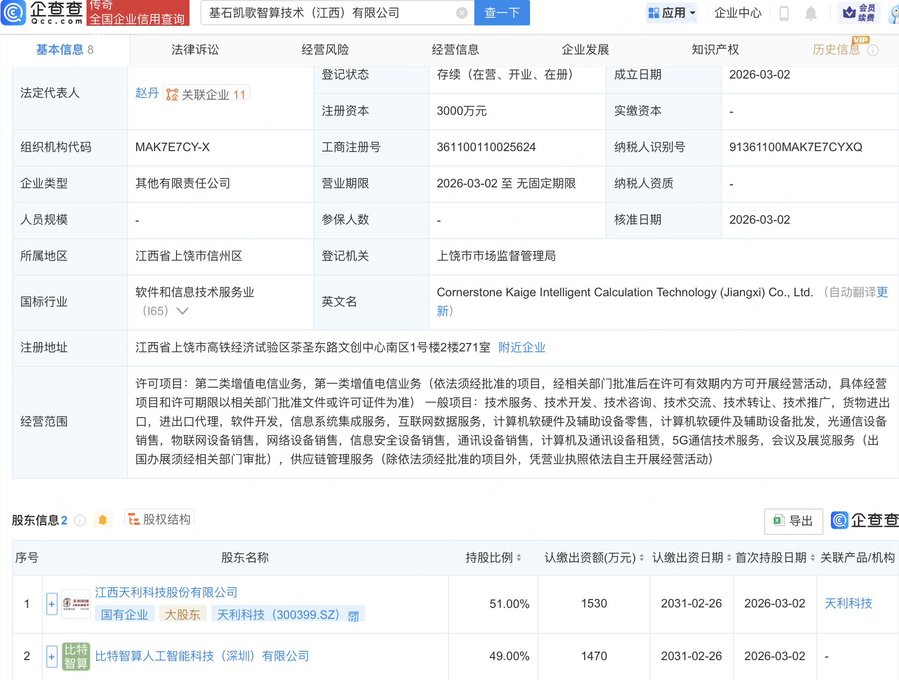 企查查APP显示,近日,基石凯歌智算技术(江西)有限公司成立,注册资本3000万元,经营范围包含:光通信设备销售,物联网设备销售,5G通信技术服务等。企查查股权穿透显示,该公司由天利科技(300399)等共同持股。