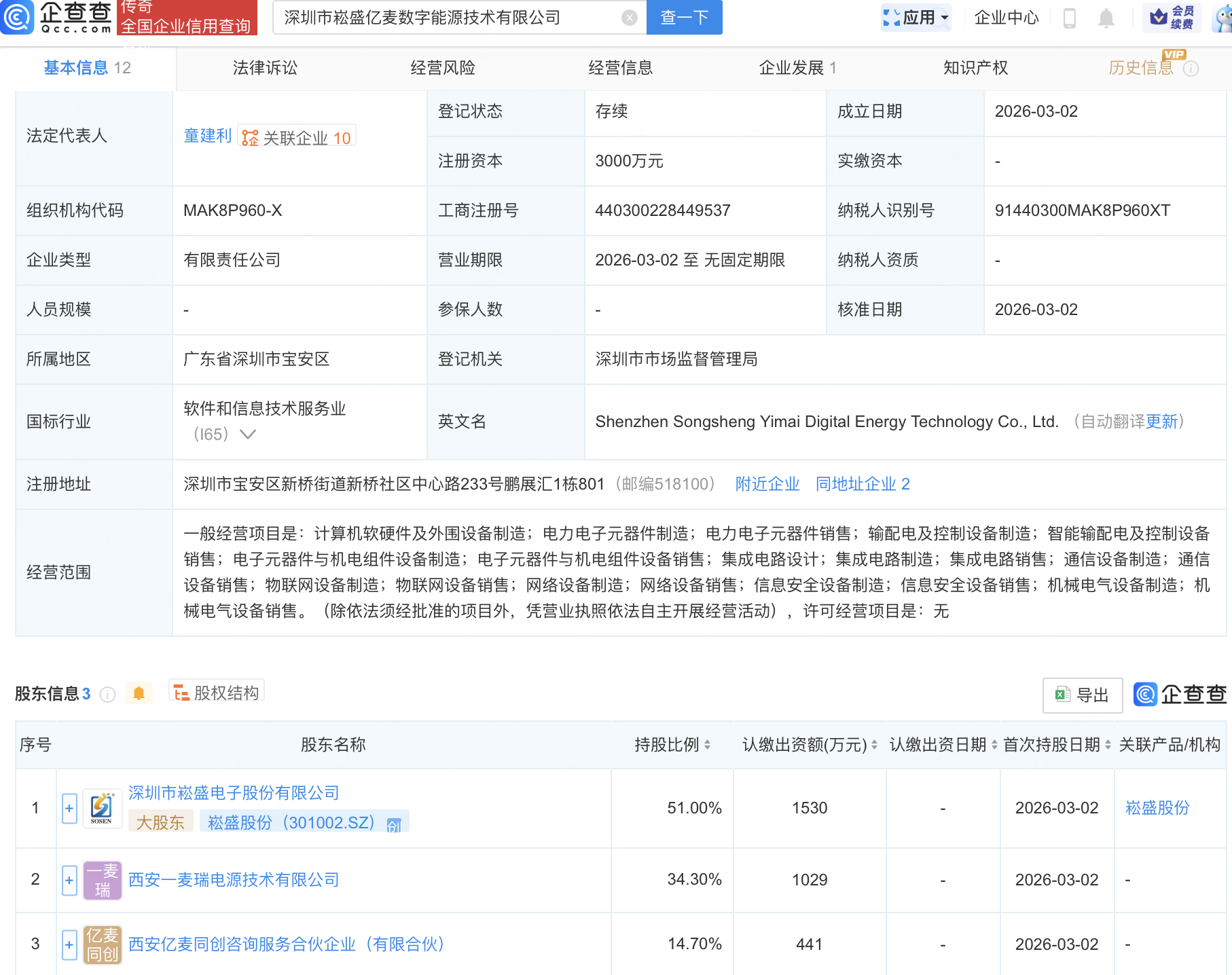 企查查APP显示,近日,深圳市崧盛亿麦数字能源技术有限公司成立,注册资本3000万元,经营范围包含:集成电路设计;集成电路制造;集成电路销售;物联网设备制造等。企查查股权穿透显示,该公司由崧盛股份(301002)等共同持股。
