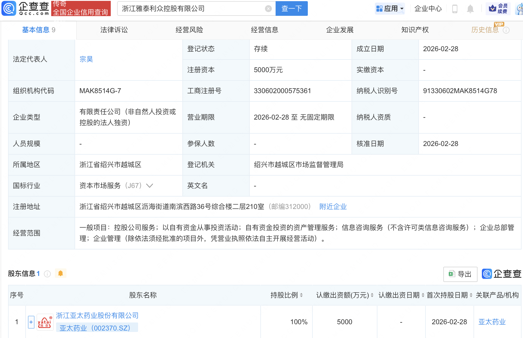 企查查APP显示,近日,浙江雅泰利众控股有限公司成立,注册资本5000万元,经营范围包含:控股公司服务;以自有资金从事投资活动;自有资金投资的资产管理服务等。企查查股权穿透显示,该公司由亚太药业(002370)全资持股。