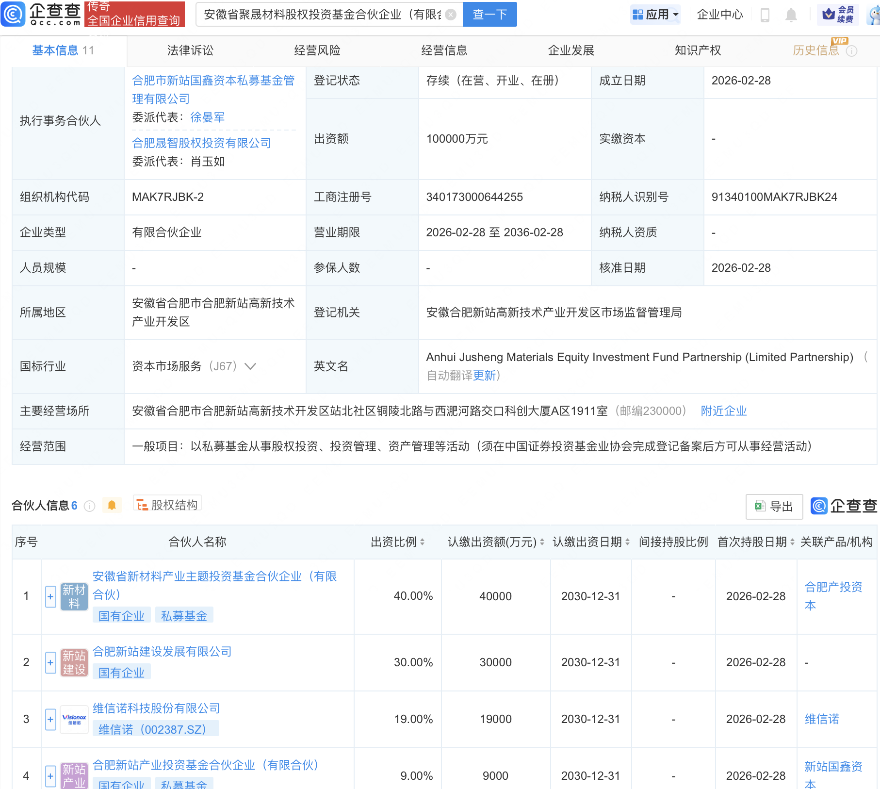 企查查APP显示,近日,安徽省聚晟材料股权投资基金合伙企业(有限合伙)成立,出资额10亿元,经营范围包含:以私募基金从事股权投资、投资管理、资产管理等活动。企查查股权穿透显示,该企业由维信诺(002387)等共同出资。