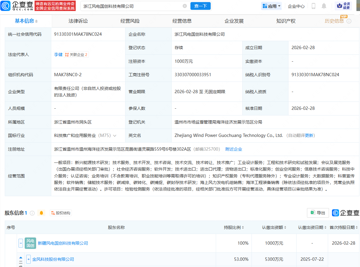 企查查APP显示,近日,浙江风电国创科技有限公司成立,法定代表人为李健,注册资本为1000万元,经营范围包含:新兴能源技术研发;大数据服务;储能技术服务;海上风力发电机组销售;海洋工程装备销售等。企查查股权穿透显示,该公司由金风科技(002202)旗下新疆风电国创科技有限公司全资持股。