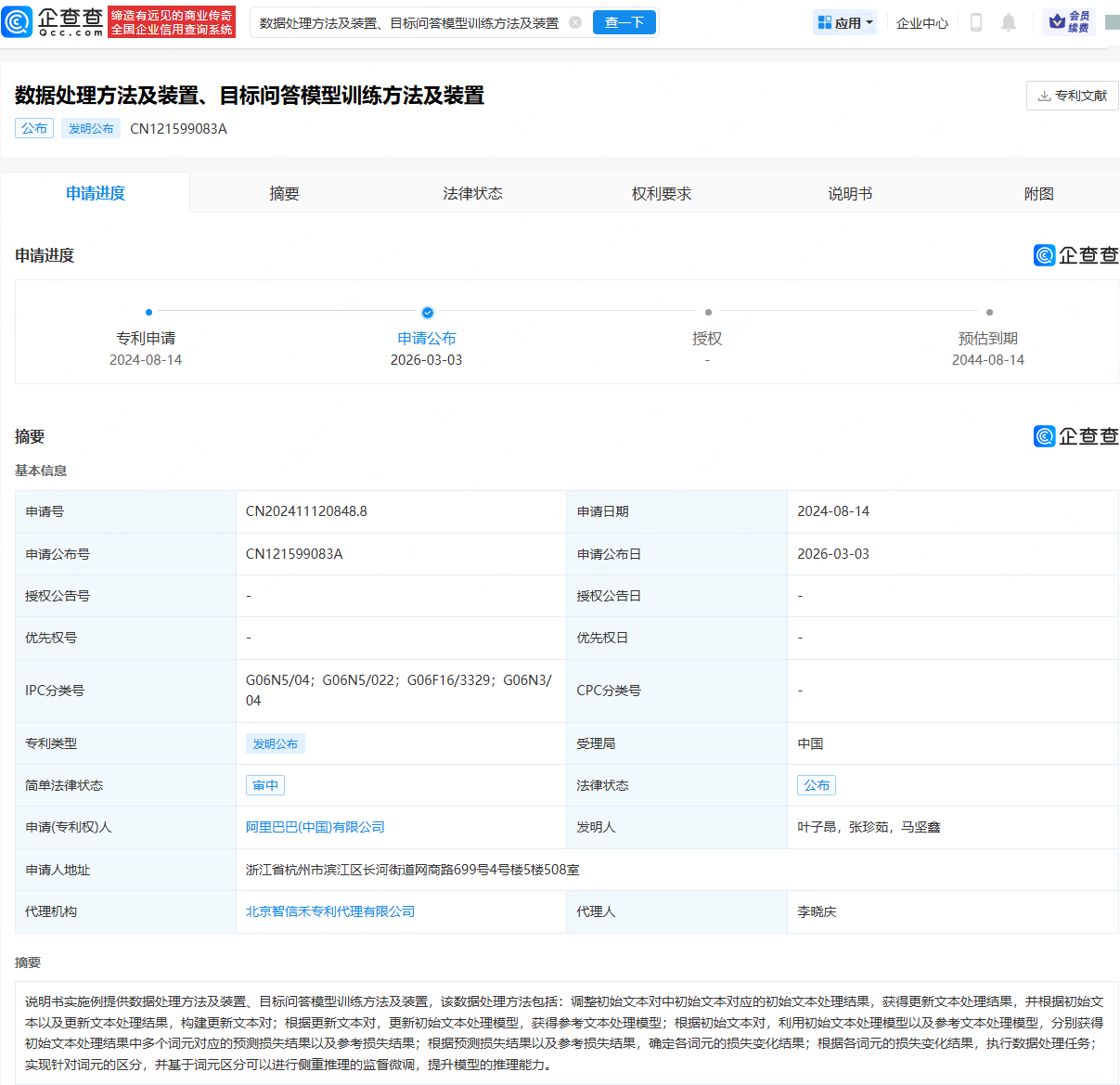 企查查APP显示,近日,阿里巴巴(中国)有限公司申请公布“数据处理方法及装置、目标问答模型训练方法及装置”专利。