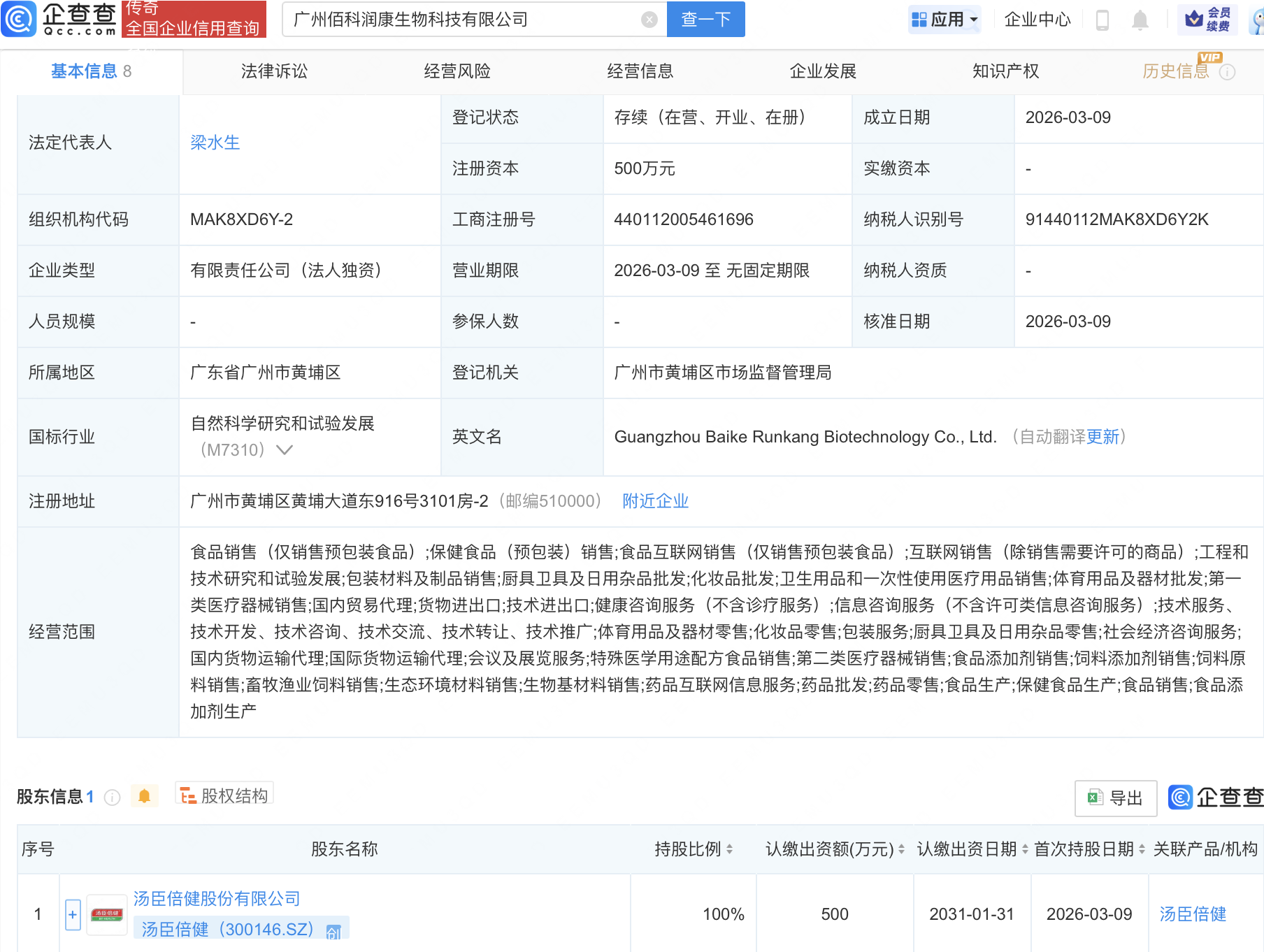 企查查APP显示,近日,广州佰科润康生物科技有限公司成立,经营范围包含:生态环境材料销售;生物基材料销售;药品互联网信息服务;药品批发等。企查查股权穿透显示,该公司由汤臣倍健(300146)全资持股。