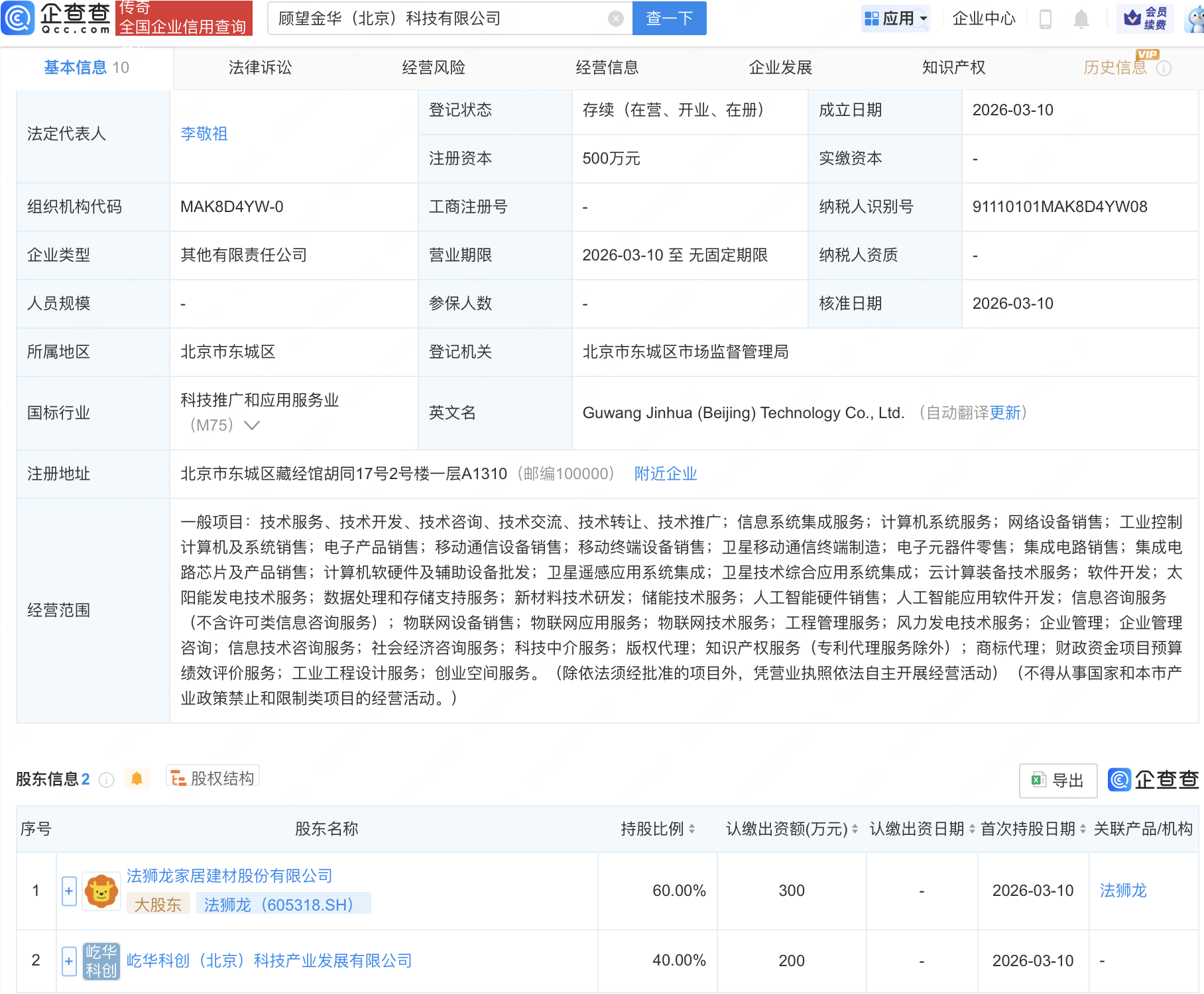 企查查APP显示,近日,顾望金华(北京)科技有限公司成立,经营范围包含:卫星遥感应用系统集成;卫星技术综合应用系统集成;人工智能硬件销售;人工智能应用软件开发等。企查查股权穿透显示,该公司由法狮龙(605318)等共同持股。