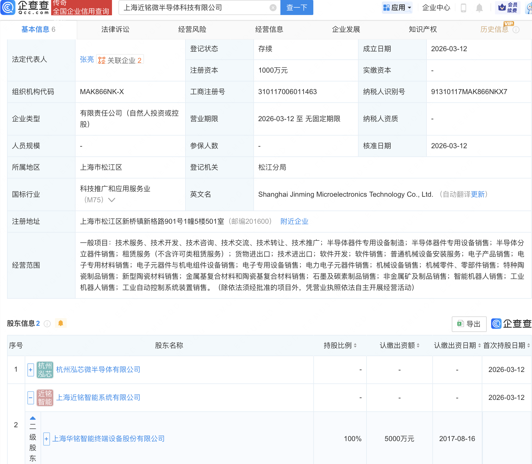 企查查APP显示,近日,上海近铭微半导体科技有限公司成立,注册资本1000万元,经营范围包含:半导体器件专用设备制造;半导体器件专用设备销售;半导体分立器件销售;租赁服务(不含许可类租赁服务)等。企查查股权穿透显示,该公司由ST华铭(300462)全资子公司上海近铭智能系统有限公司等共同持股。