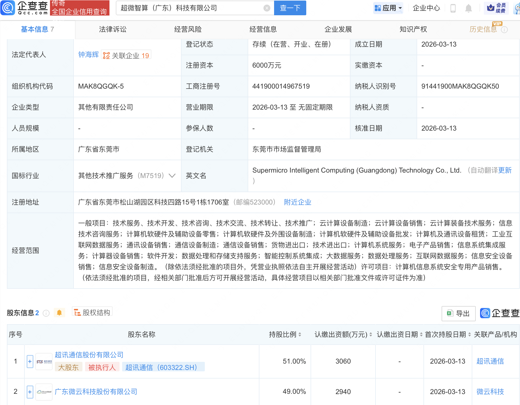 企查查APP显示,近日,超微智算(广东)科技有限公司成立,注册资本6000万元,经营范围包含:云计算设备制造;云计算设备销售;云计算装备技术服务;信息技术咨询服务;计算机软硬件及辅助设备零售等。企查查股权穿透显示,该公司由超讯通信(603322)等共同持股。