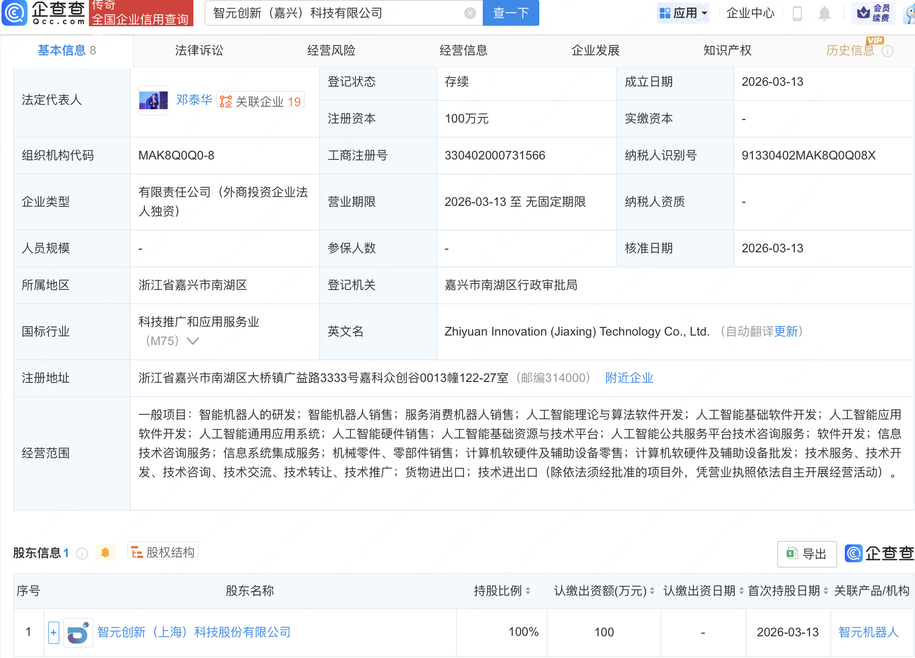 企查查APP显示,近日,智元创新(嘉兴)科技有限公司成立,经营范围包含:智能机器人的研发;智能机器人销售;服务消费机器人销售;人工智能理论与算法软件开发;人工智能基础软件开发等。企查查股权穿透显示,该公司由智元机器人关联公司智元创新(上海)科技股份有限公司全资持股。