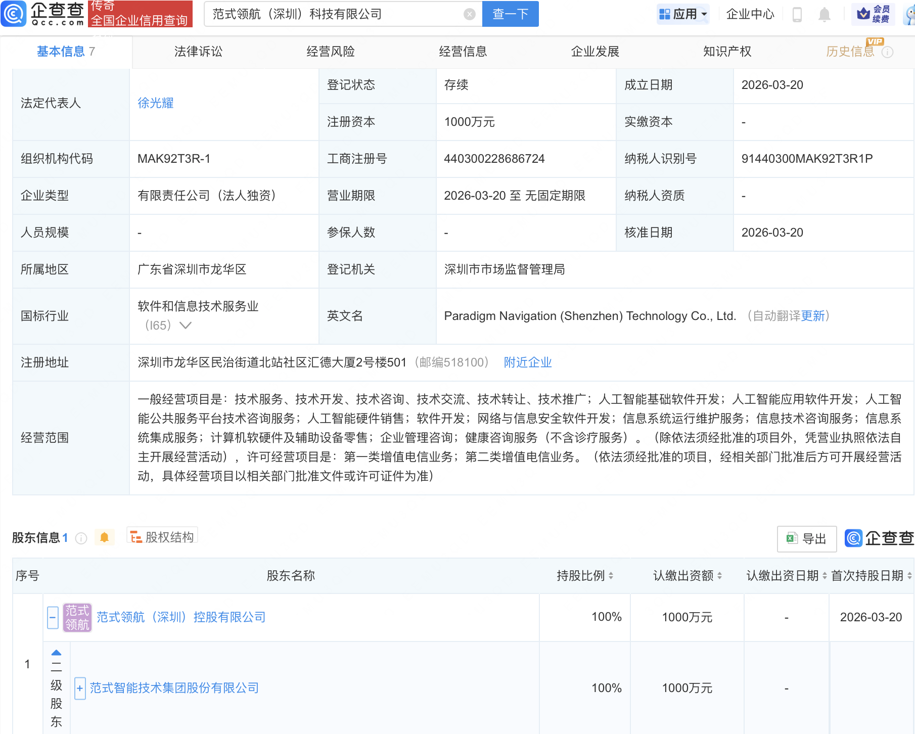 企查查APP显示,近日,范式领航(深圳)科技有限公司成立,注册资本1000万元,经营范围包含:人工智能基础软件开发;人工智能应用软件开发;人工智能公共服务平台技术咨询服务;人工智能硬件销售等。企查查股权穿透显示,该公司由范式智能(06682.HK)间接全资持股。
