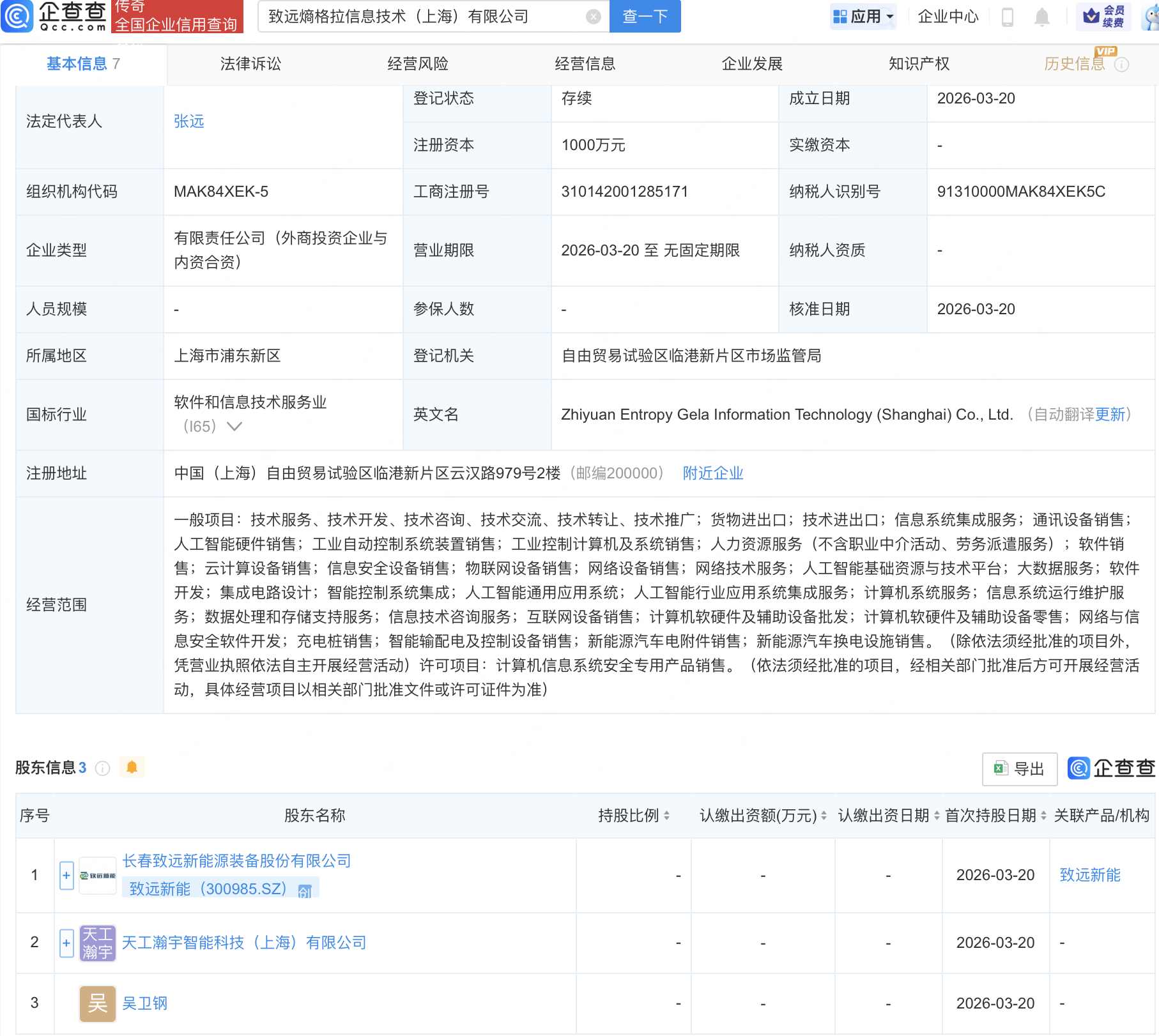 企查查APP显示,近日,致远熵格拉信息技术(上海)有限公司成立,注册资本1000万元,经营范围包含:人工智能基础资源与技术平台;集成电路设计;人工智能行业应用系统集成服务等。企查查股权穿透显示,该公司由致远新能(300985)等共同持股。