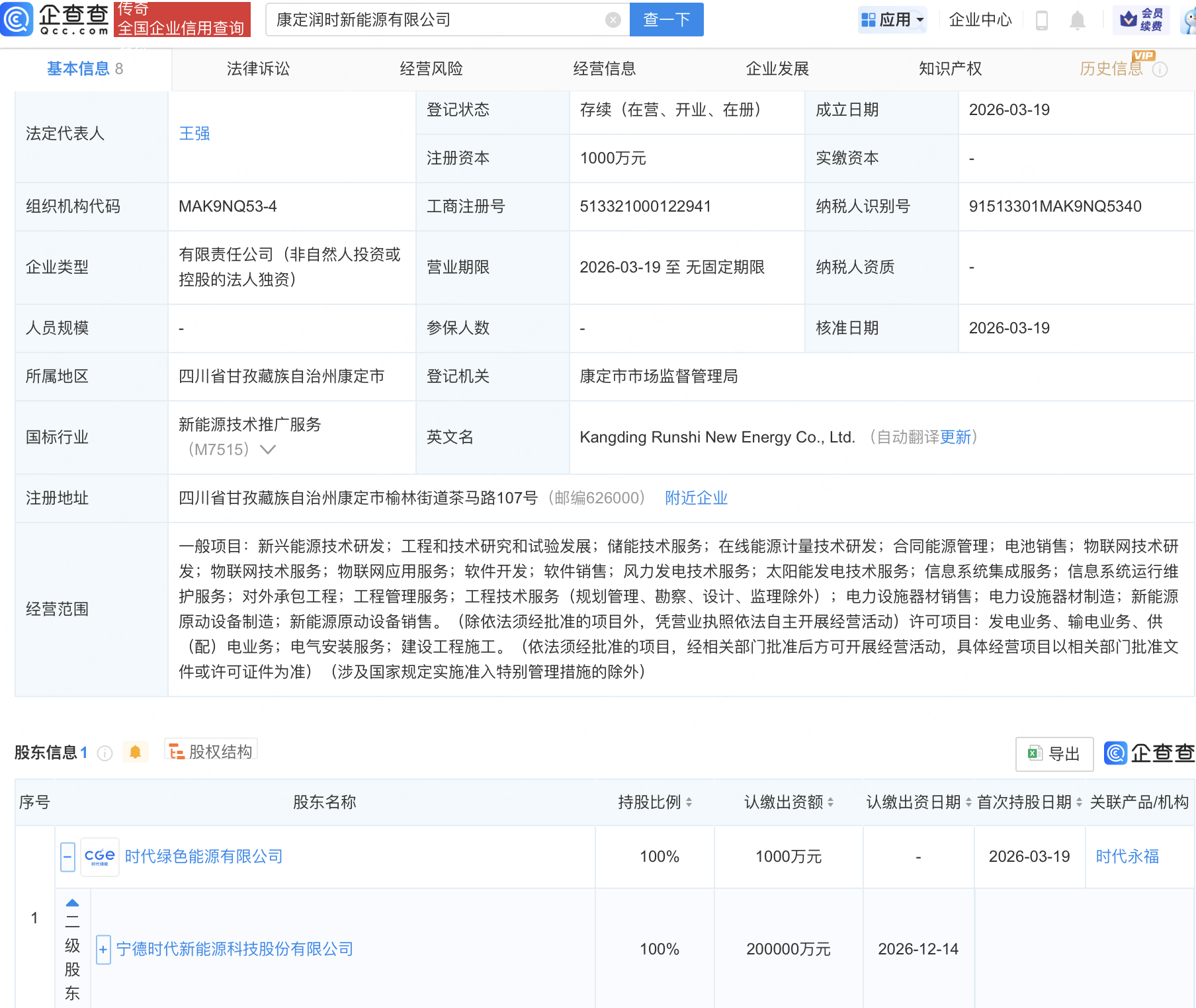 企查查APP显示,近日,康定润时新能源有限公司成立,注册资本1000万元,经营范围包含:电力设施器材销售;电力设施器材制造;新能源原动设备制造;新能源原动设备销售等。企查查股权穿透显示,该公司由宁德时代(300750)间接全资持股。