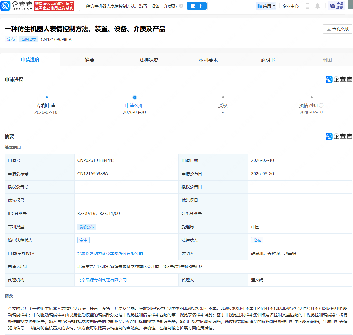 企查查APP显示,近日,北京松延动力科技集团股份有限公司申请公布“一种仿生机器人表情控制方法、装置、设备、介质及产品”专利。