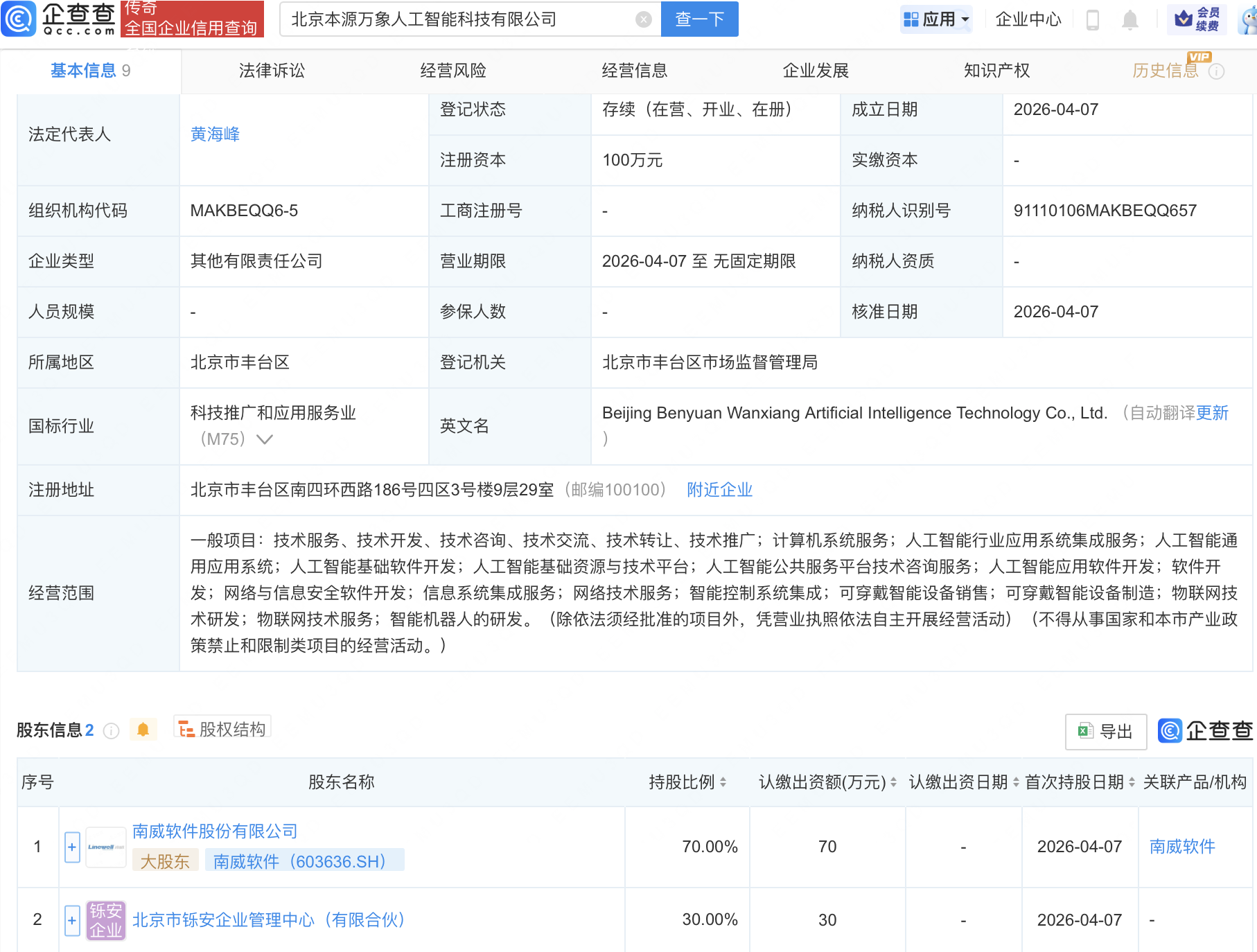 企查查APP显示,近日,北京本源万象人工智能科技有限公司成立,经营范围包含:人工智能行业应用系统集成服务;人工智能通用应用系统;人工智能基础软件开发;人工智能基础资源与技术平台等。企查查股权穿透显示,该公司由南威软件(603636)等共同持股。