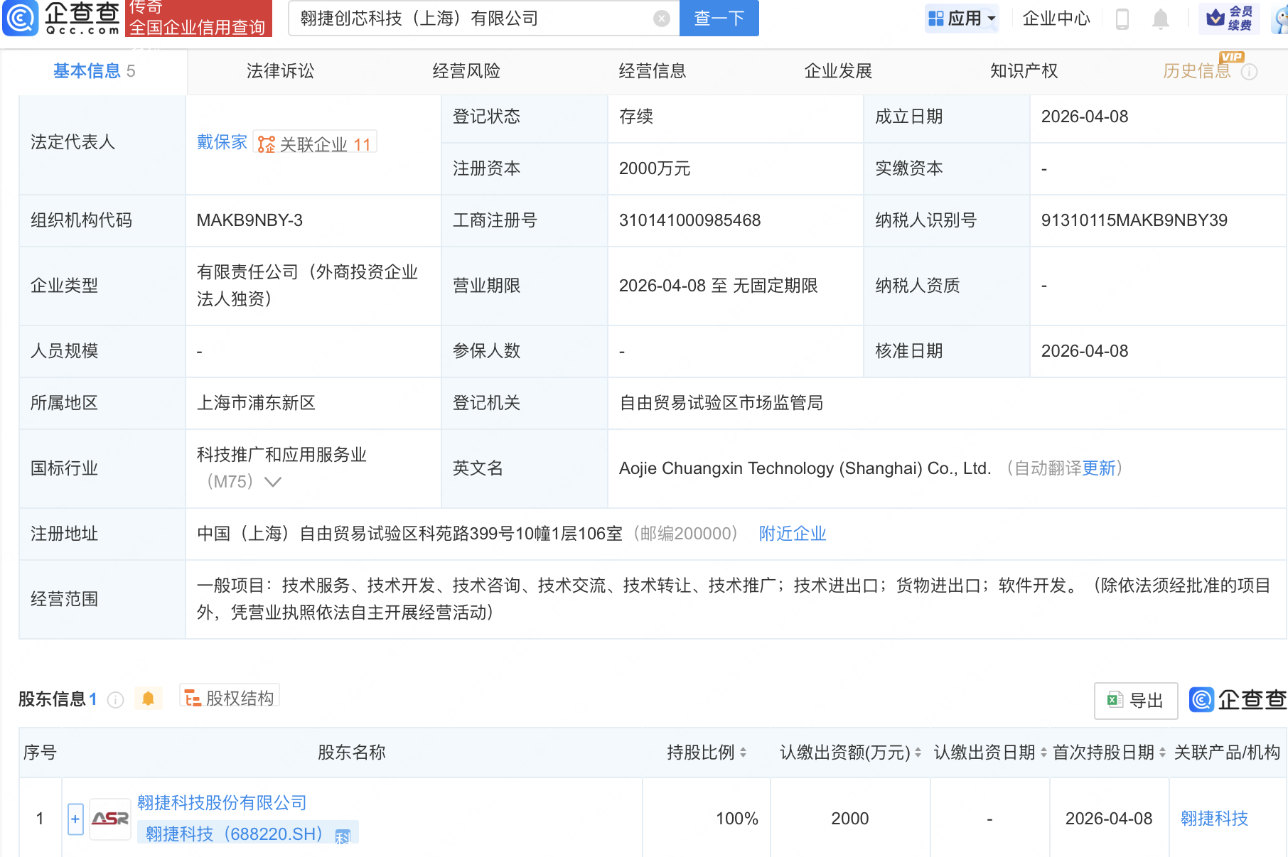 企查查APP显示,近日,翱捷创芯科技(上海)有限公司成立,注册资本2000万元,经营范围包含:技术服务、技术开发、技术咨询、技术交流、技术转让、技术推广;技术进出口;货物进出口;软件开发。企查查股权穿透显示,该公司由翱捷科技(688220)全资持股。