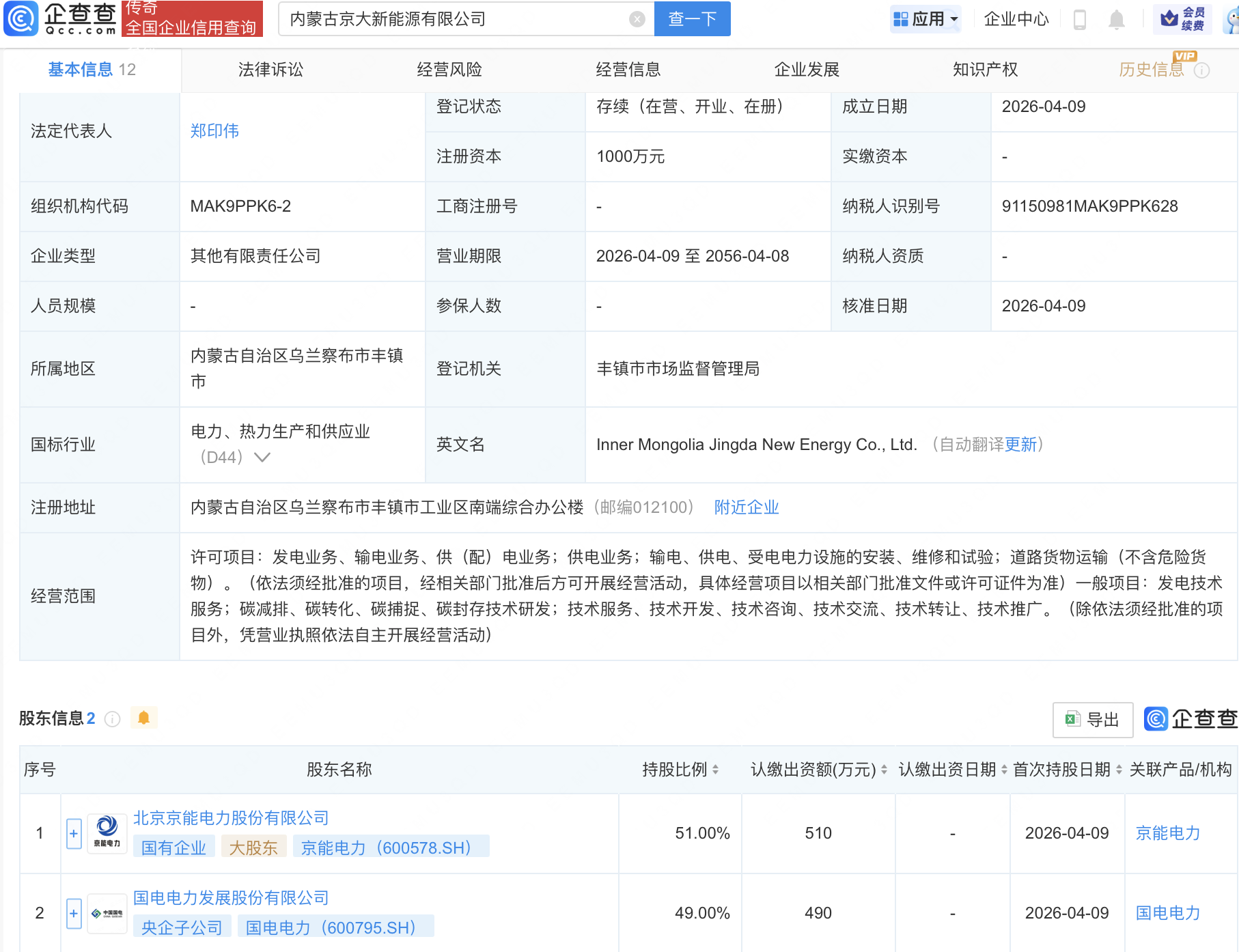 企查查APP显示,近日,内蒙古京大新能源有限公司成立,经营范围包含:发电技术服务;碳减排、碳转化、碳捕捉、碳封存技术研发等。企查查股权穿透显示,该公司由京能电力(600578)、国电电力(600795)共同持股。