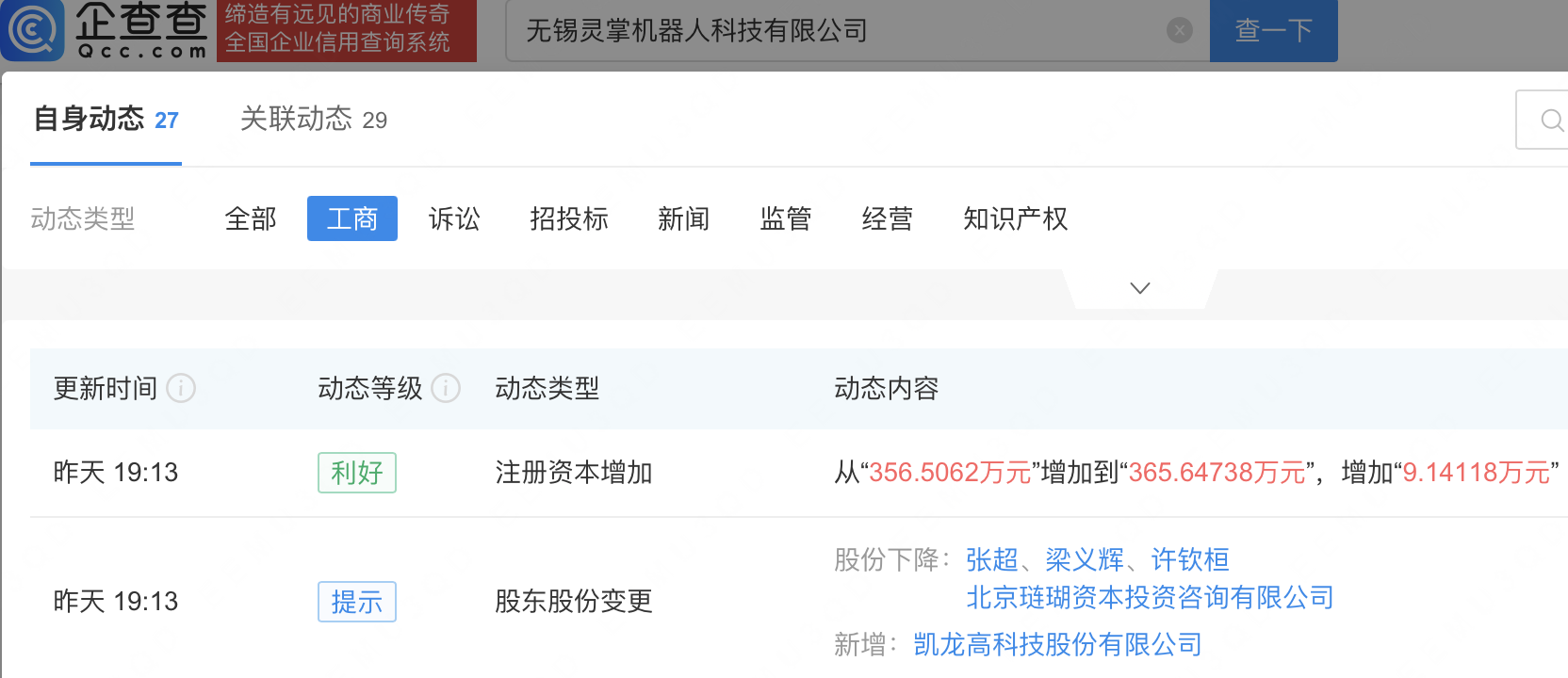 企查查APP显示,近日,无锡灵掌机器人科技有限公司发生工商变更,新增凯龙高科(300912)为股东,同时注册资本增至365.65万元。企查查信息显示,该公司成立于2024年,经营范围包含:智能机器人的研发;人工智能基础资源与技术平台;人工智能行业应用系统集成服务;人工智能公共数据平台等。