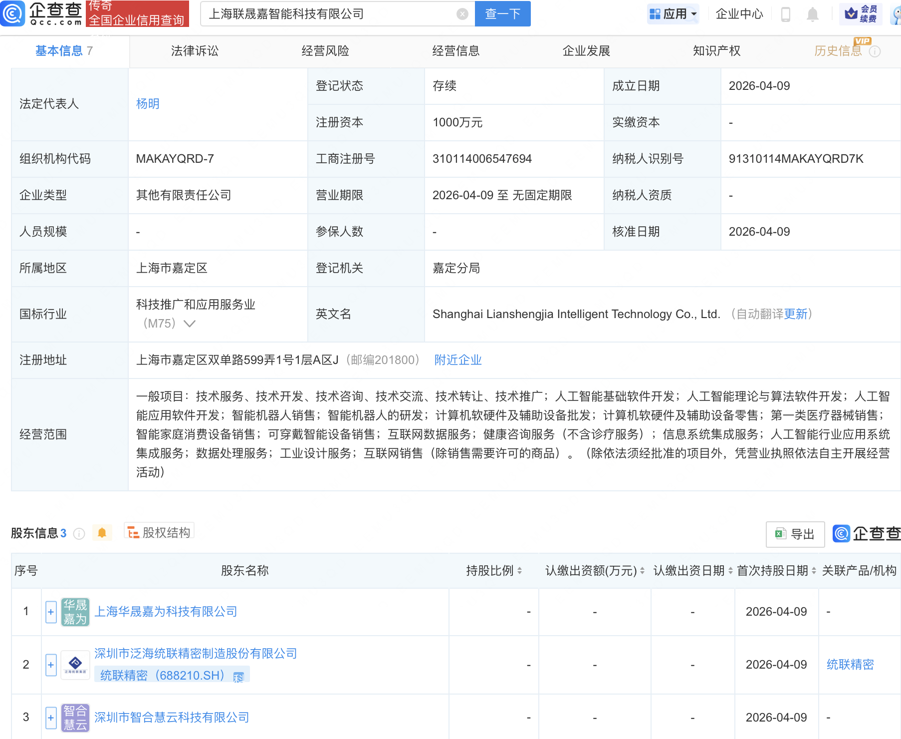 统联精密等成立智能科技公司,含AI及机器人业务