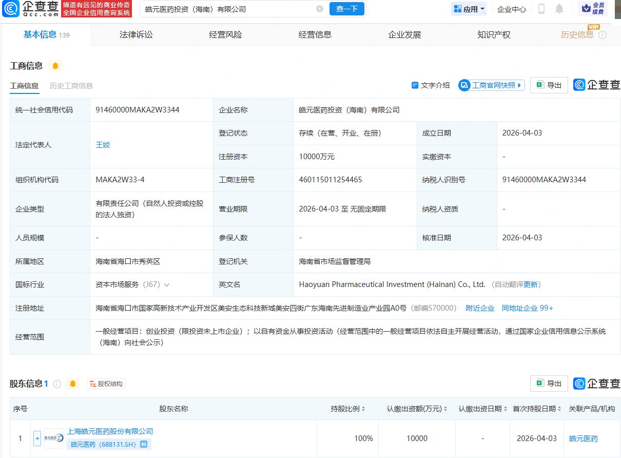 企查查APP显示,近日,皓元医药投资(海南)有限公司成立,法定代表人为王姣,注册资本为1亿元,经营范围包含:创业投资(限投资未上市企业);以自有资金从事投资活动。企查查股权穿透显示,该公司由皓元医药(688131)全资持股。