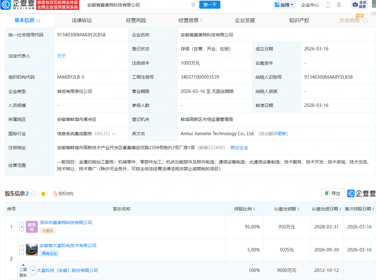 企查查APP显示,近日,安徽省嘉美特科技有限公司成立,法定代表人为万于,注册资本为1000万元,经营范围包含:金属切削加工服务;机械零件、零部件加工;机床功能部件及附件制造;通信设备制造;光通信设备制造等。企查查股权穿透显示,该公司由深圳市嘉美特科技有限公司、大富科技(300134)全资子公司安徽省大富机电技术有限公司共同持股。