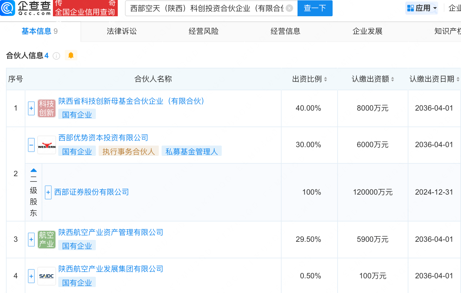 企查查APP显示,近日,西部空天(陕西)科创投资合伙企业(有限合伙)成立,出资额2亿元,经营范围包含:以自有资金从事投资活动;创业投资(限投资未上市企业)。企查查股权穿透显示,该企业由陕西省科技创新母基金合伙企业(有限合伙)、西部证券(002673)全资子公司西部优势资本投资有限公司、陕西航空产业资产管理有限公司、陕西航空产业发展集团有限公司共同出资。