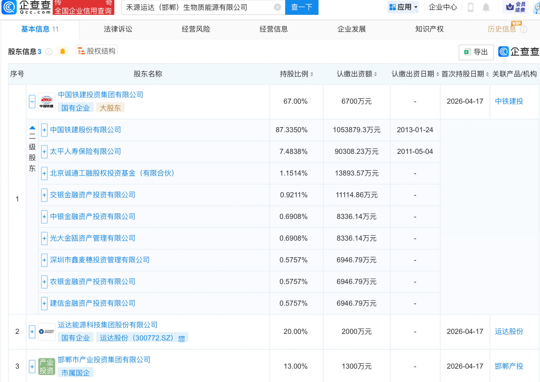 企查查APP显示,近日,禾源运达(邯郸)生物质能源有限公司成立,注册资本1亿元,经营范围包含:生物质成型燃料销售;生物质能技术服务;生物质液体燃料生产工艺研发等。企查查股权穿透显示,该公司由中国铁建(601186)旗下中国铁建投资集团有限公司、运达股份(300772)等共同持股。