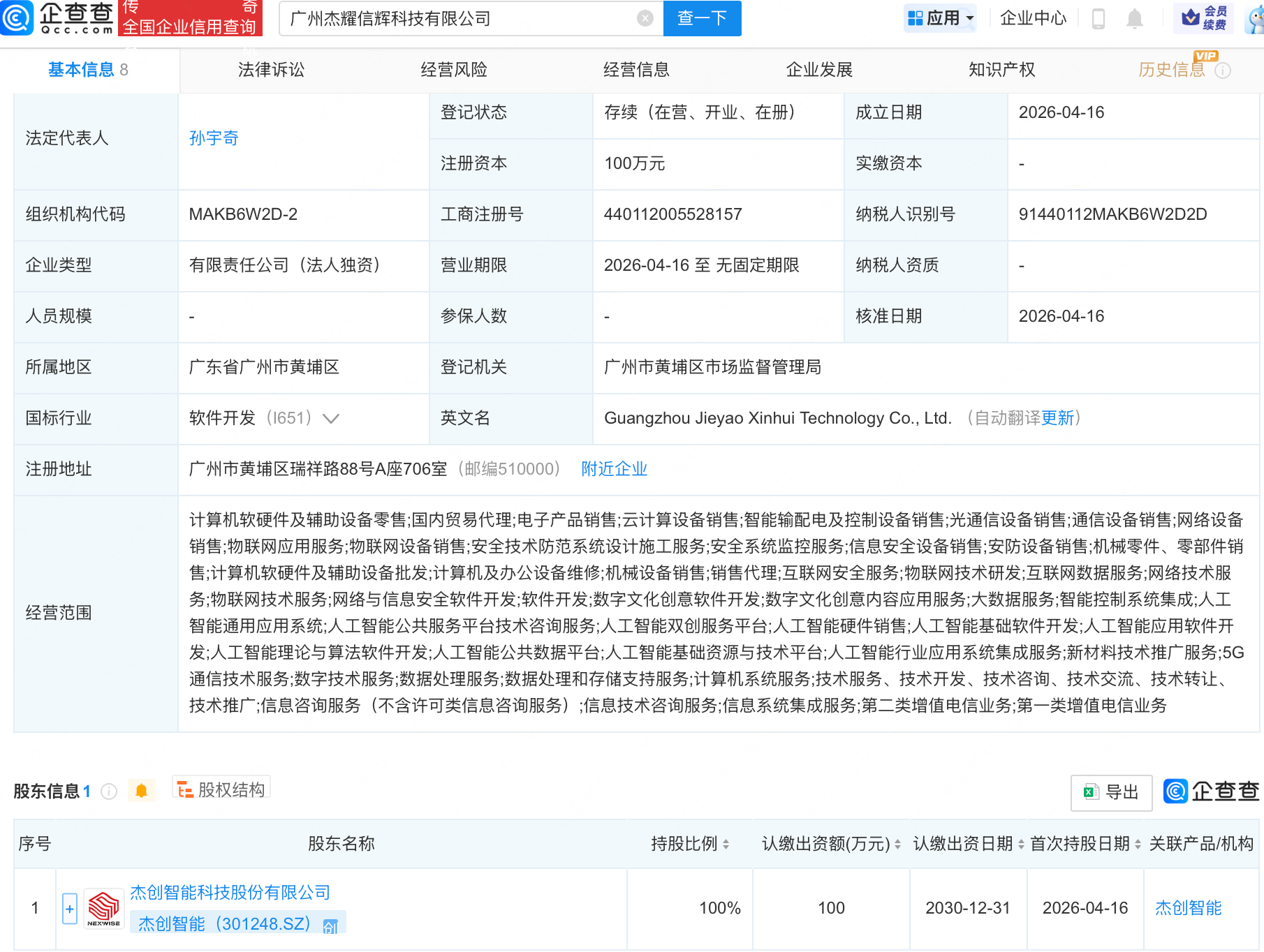企查查APP显示,近日,广州杰耀信辉科技有限公司成立,经营范围包含:人工智能基础软件开发;人工智能应用软件开发;人工智能理论与算法软件开发;人工智能公共数据平台等。企查查股权穿透显示,该公司由杰创智能(301248)全资持股。