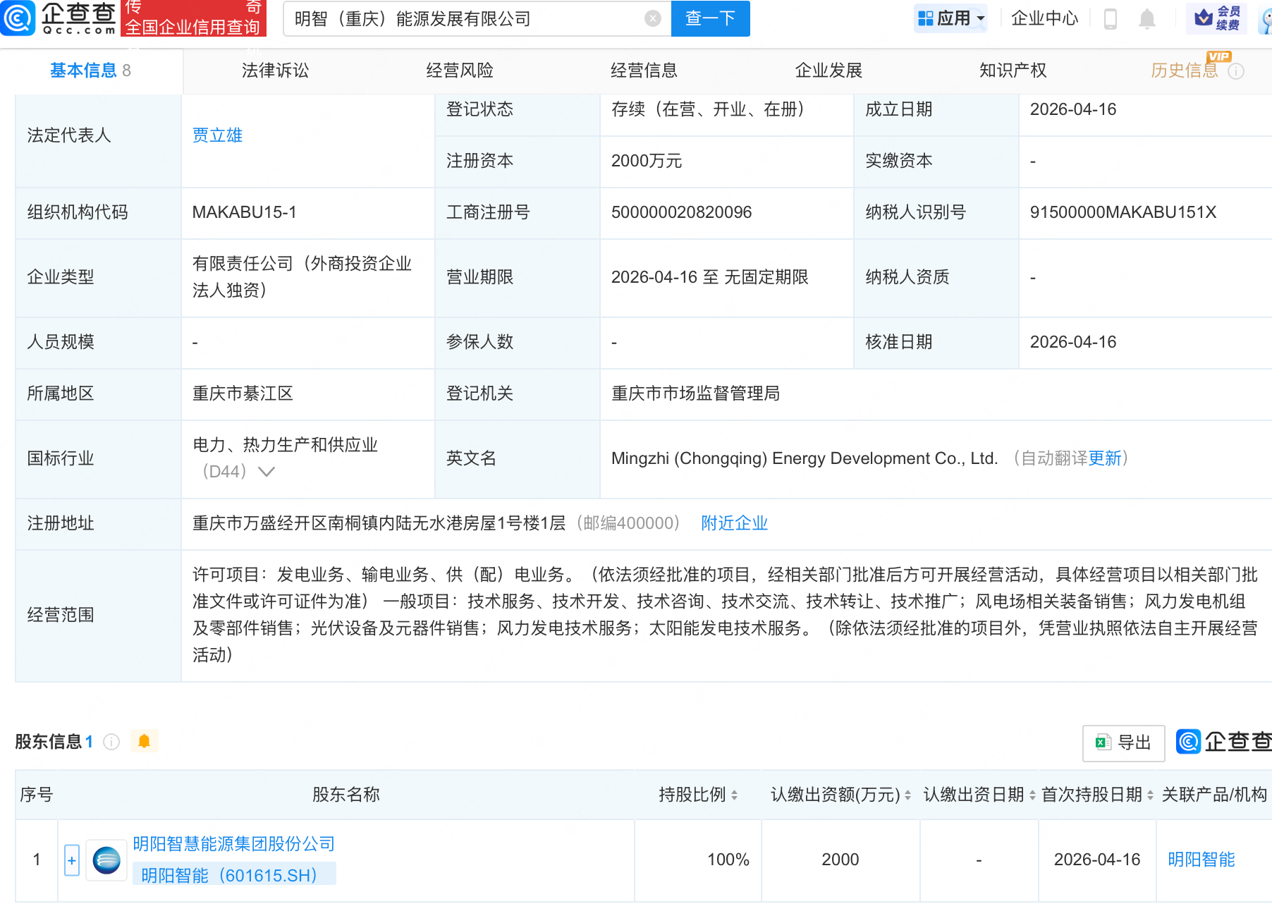 明阳智能在重庆成立能源发展新公司