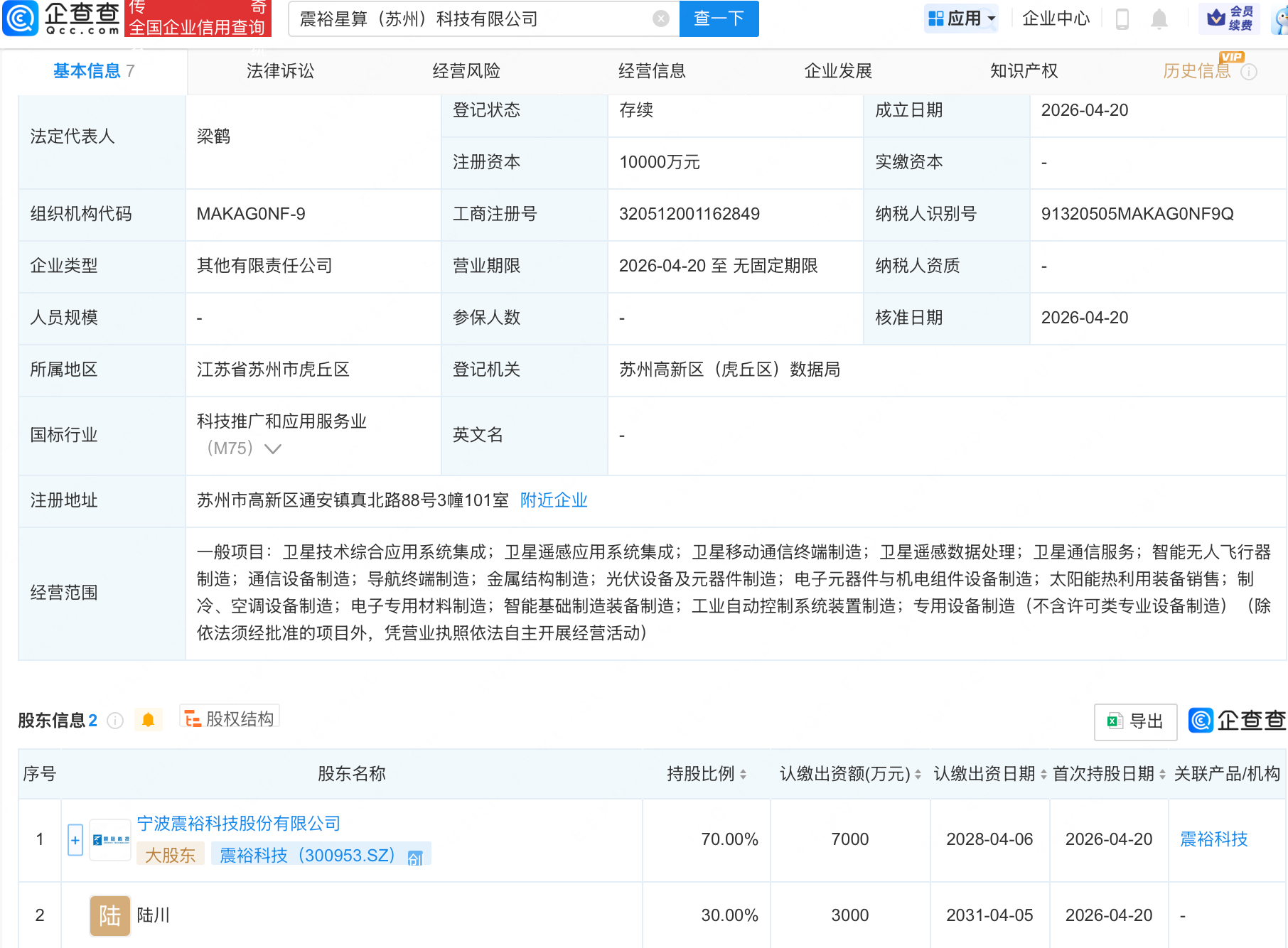 企查查APP显示,近日,震裕星算(苏州)科技有限公司成立,注册资本1亿元,经营范围包含:卫星技术综合应用系统集成;卫星遥感应用系统集成;卫星移动通信终端制造;卫星遥感数据处理等。企查查股权穿透显示,该公司由震裕科技(300953)等共同持股。