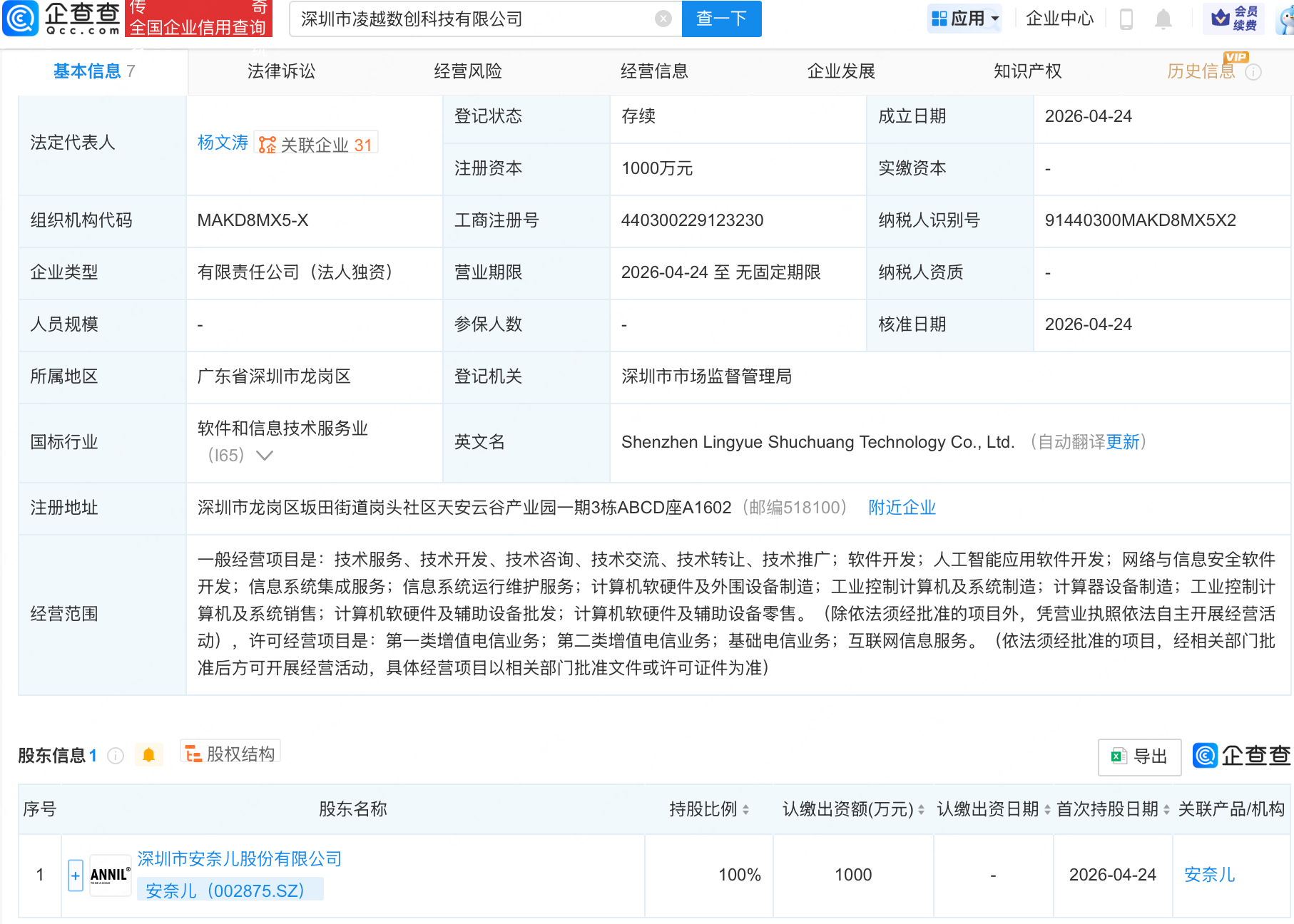 企查查APP显示,近日,深圳市凌越数创科技有限公司成立,经营范围包含:人工智能应用软件开发;网络与信息安全软件开发;信息系统集成服务;信息系统运行维护服务等。企查查股权穿透显示,该公司由安奈儿(002875)全资持股。