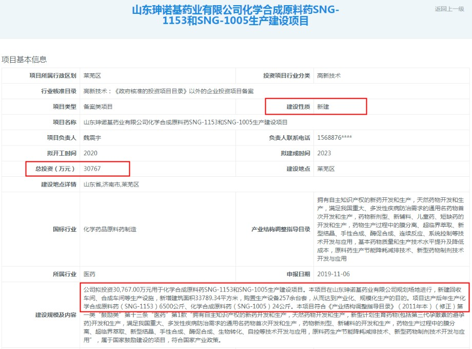 据盛诺基招股书,本次IPO,盛诺基拟募集30,767万元建设化学合成原料药SNG-1153和SNG-1005生产建设项目(下称“原料药项目”),建设周期3年,实施主体是全资子公司山东珅诺基药业有限公司。该项目的环评批复在招股书公示时还未取得。