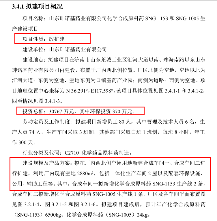据济南市生态环境局公示的原料药项目环评文件,该项目投资总额为30,767万元,项目建设性质则变成扩建。并且在项目投资总额不变的情况下,建设内容出现了缩水。原料药项目拟在厂内西北侧空闲用地新建合成车间一、合成车间二进行扩建,利用厂内现有空地2,880平方米,包括一体化生产车间2座以及配套环保设施、公用、辅助工程等。由此看出,环评文件披露的项目建设内容与招股书、备案披露的信息差异甚大。