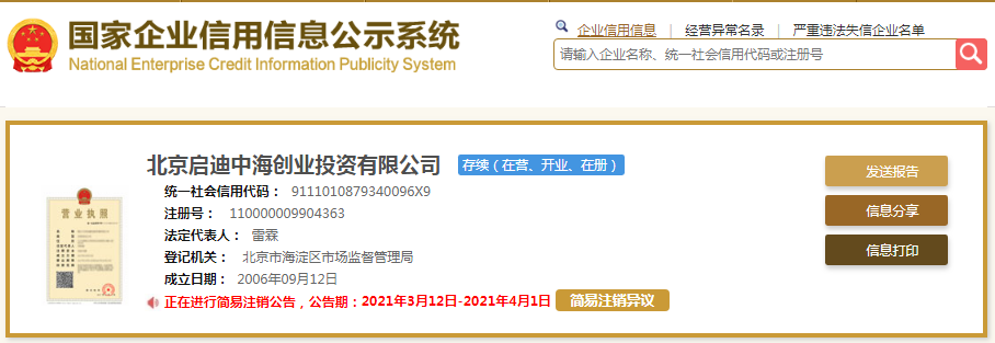 启迪中海在2019年4月将持有的全部股权(对应注册资本370,810美元)转让给Yu Jingcheng,转让对价为1,055.69万元人民币。根据企查查信息,启迪中海成立于2006年,出资人是启迪创业投资有限公司、北京中关村创业投资发展有限公司、北京中海投资管理有限公司,背后的实控人是清华大学教育基金会。目前,启迪中海进入了简易注销程序。