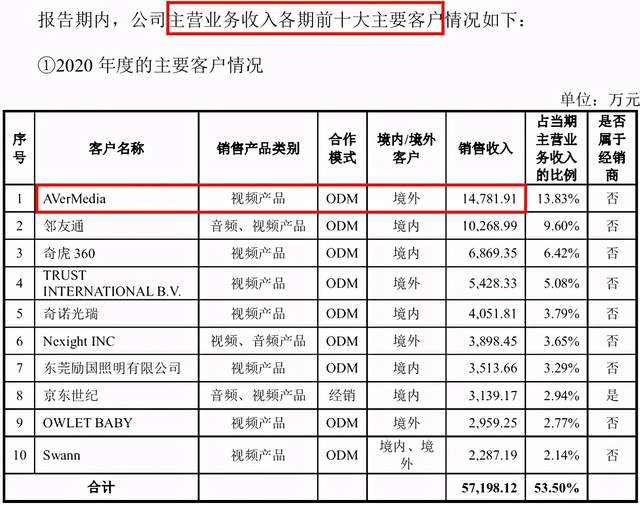 招股书第185页分析了奥尼电子报告期内前五名客户的销售情况,2020年,第一大客户AVerMedia Technologies, Inc.(下称“AVerMedia”)是台湾省上市公司。奥尼电子对其销售视频产品14,781.91万元,占比为13.83%,注释中提及该数据合并了AVerMedia和全资子公司圆刚多媒体科技(上海)有限公司等。