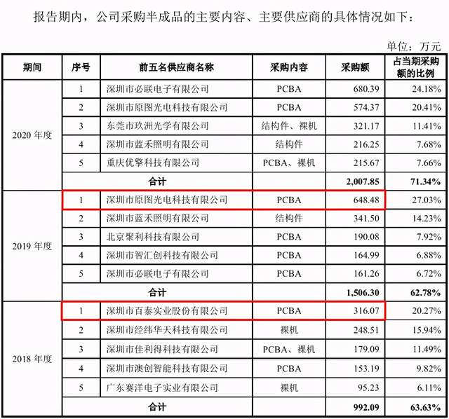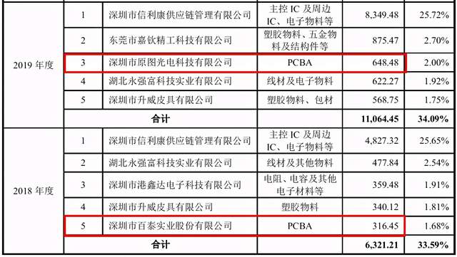 招股书第231页至232页披露了奥尼电子报告期内前五名供应商的采购情况。2018年,奥尼电子向第五大供应商深圳市百泰实业股份有限公司(下称“百泰实业”)采购原材料PCBA 316.45万元;2019年,奥尼电子向第三大供应商深圳市原图光电科技有限公司(下称“原图光电”)采购PCBA 648.48万元。奥尼电子采购的PCBA属于半成品。