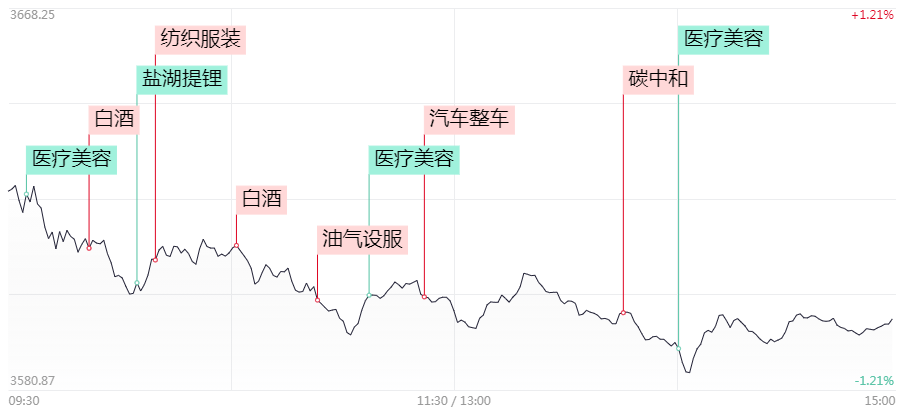 三大指数早盘集体走弱,高位板块明显分化,前期活跃的医美、盐湖提锂等趋势板块成杀跌主力,创业板指盘中跌幅不断扩大,沪指和深成指跟随下行。午后两市弱势震荡,沪指失守3600点,创业板指一度跌超2%,市场热点稀少,仅碳中和、纺织服装略显活跃,军工、券商等跌幅居前,个股呈现普跌格局,炸板率较高。