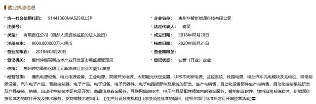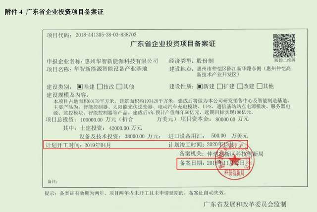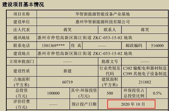 但2019年5月,惠州仲恺高新区官网公示的该项目环评文件显示,华智新能源智能设备产业基地项目2019年5月开始施工建设,建设周期为18个月,预计投产日期为2020年10月。