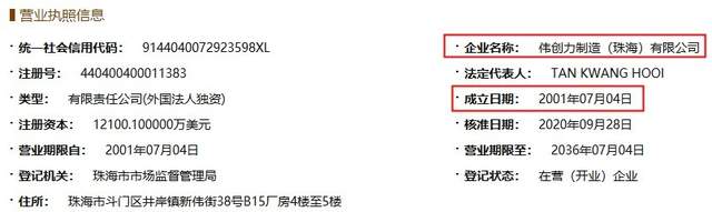 董事、副总经理柯妹国2001年5月入职伟创力制造(珠海)有限公司,企信网显示该企业2001年7月4日成立,企业成立时间比柯妹国入职时间晚了2个月。
