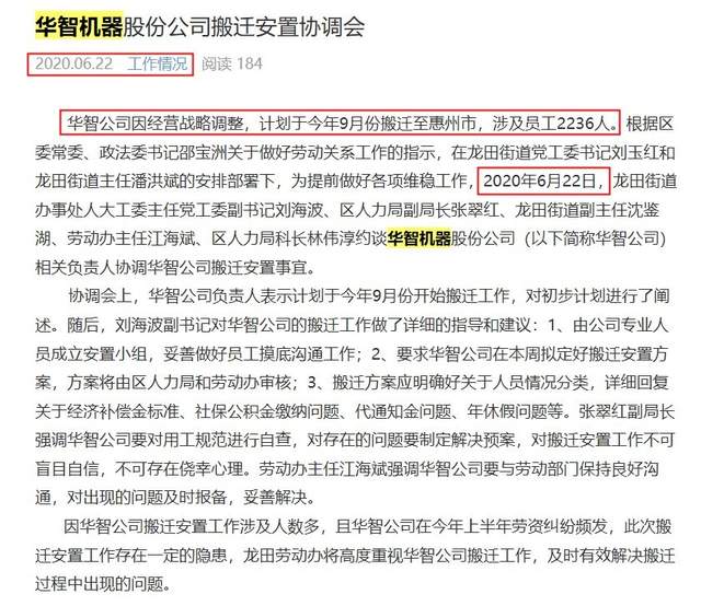 巧合的是,在美篇平台一个昵称为“工作情况”账号,该账户以发布坪山区龙田街道的工作日常为主,在2020年6月22日该账号发布了一篇“华智机器股份公司搬迁安置协调会”的文章,该内容显示,华智股份因经营战略调整,计划于9月搬迁至惠州市,涉及员工2,236人。