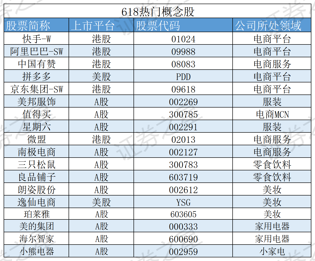 在此,证券之星也梳理了一份“618热门概念股”名单,电商平台有京东、阿里巴巴、拼多多,电商服务有微盟、中国有赞等;零食饮料有三只松鼠、良品铺子等,美妆电商有珀莱雅、朗姿股份等。
