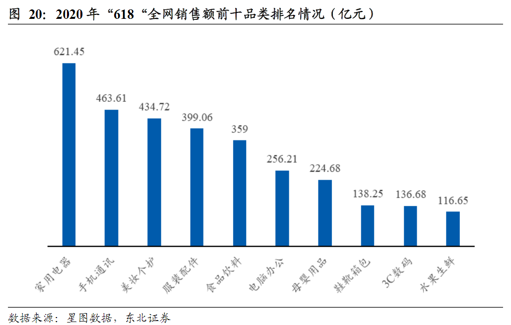 从“618”品类消费结构来看,去年3C家电、美妆个护、服装以及食品饮料仍是主要消费品类,其中家用电器以621.45亿元的销售额摘得品类销售冠军。