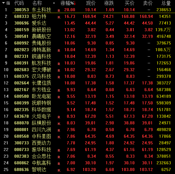 军工午后继续走强,爱乐达、新研股份、晨曦航空涨超15%,航发科技、长鹰信质、贵绳股份等此前涨停,中航沈飞、中航高科、海兰信、天和防务、中简科技等纷纷冲高。